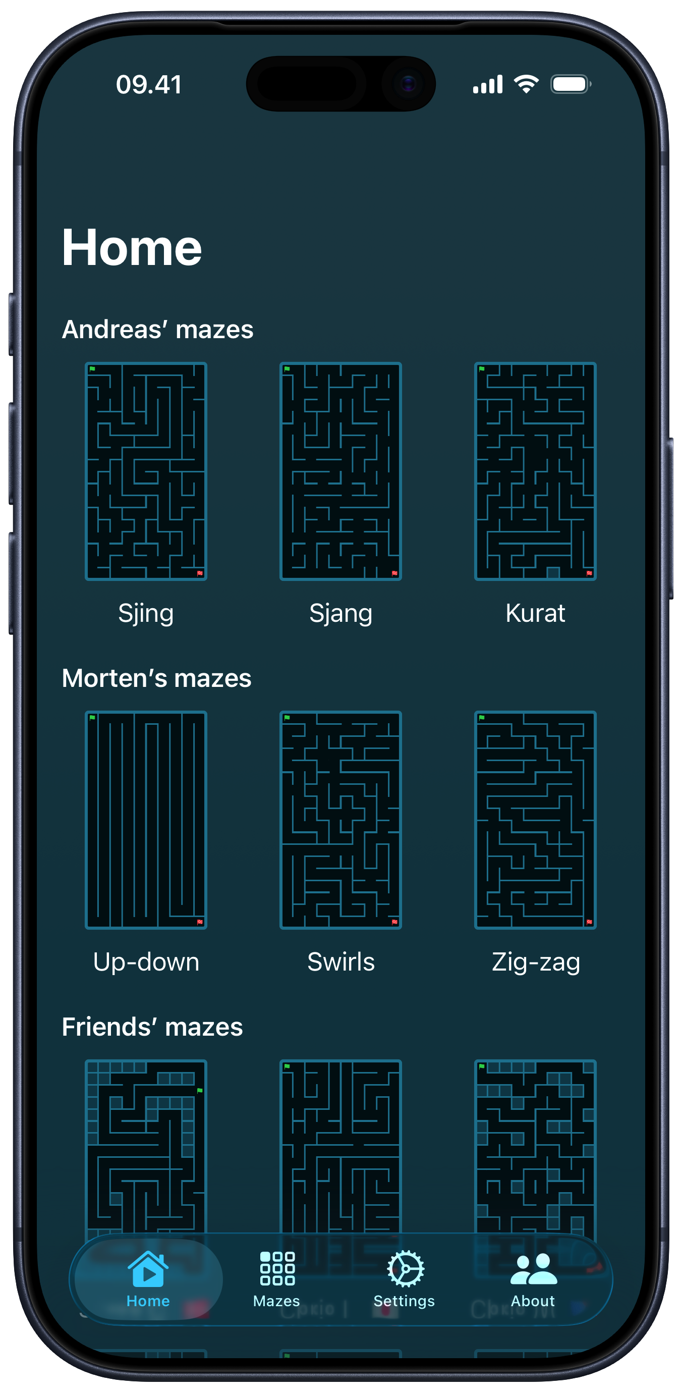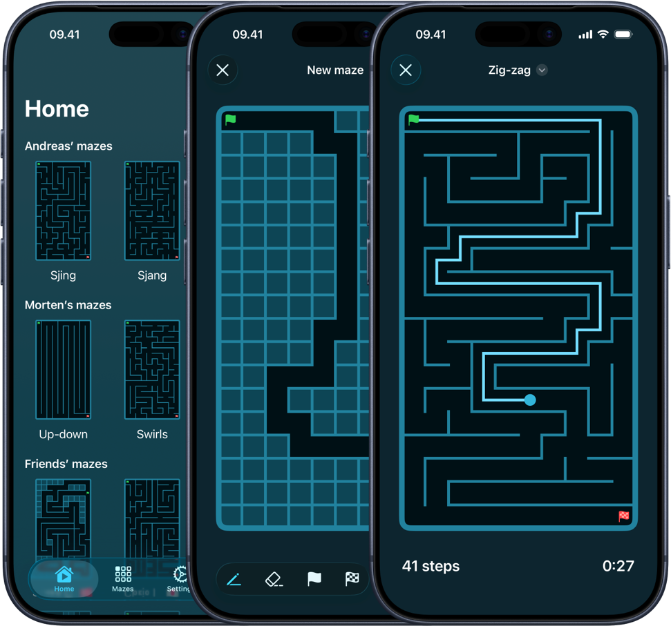 Morten tried a lot of Andreas' mazes, but Andreas wanted a way to share them with friends and family. Miniotaur keeps the charm of pencil-and-paper mazes and adds modern touches like instant sharing, and leaderboards.